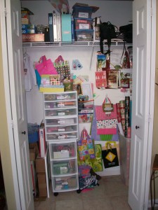 Having all of your “stuff” in one location in your home is the key to staying organized. No more running from this room to that to gather all of the things you need for one “simple” project. Decide where you are most likely to create your projects. Not where it is most convenient to store them. Yes, read that statement again. I used to keep all of my stuff tucked in a basement corner in plastic organizers. When I wanted to be crafty, I’d run all the way down to the basement, gather them up and bring them upstairs to the kitchen island. Dumb. It wasn’t efficient. So, I re-purposed a first floor closet. Removing those “traditional” closet items (coats, jackets, umbrellas), I made it into my craft closet. Genuis! (Yes, it did mean finding a new home for everything I took out of the closet…yet another project).