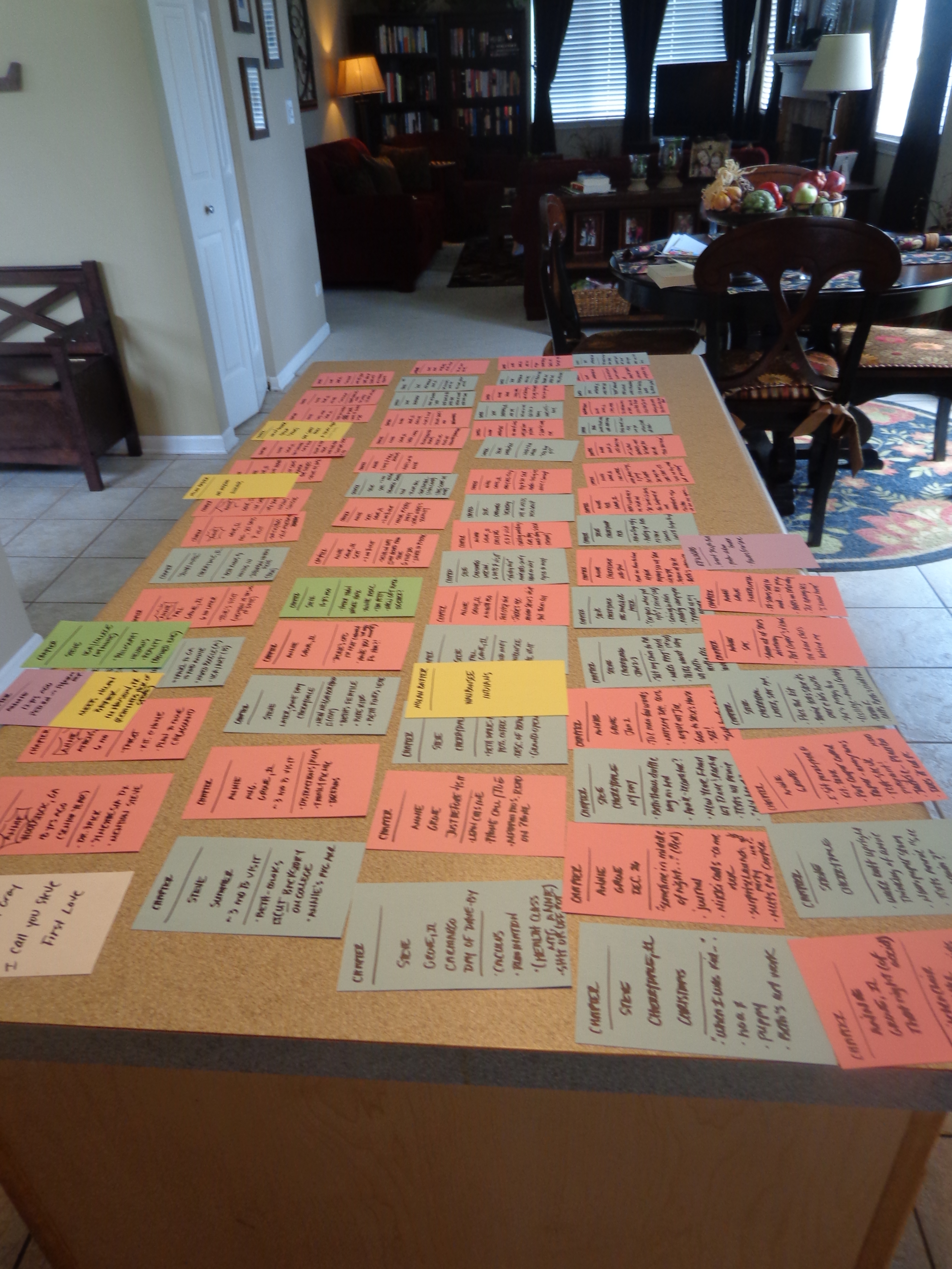 - But the problem is, there are a lot of cards that are left blank. Meaning, they have plot points on them, but I am not sure if I like it, if it needs to be cut, if it’s even relevant. Some of those cards are just transition chapters…and do they need to stay? I don’t know yet.
