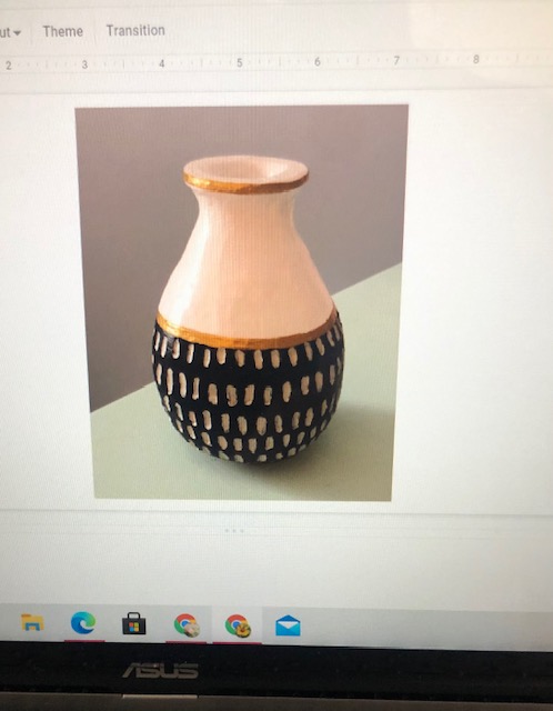 Kate, pictured below, with her virtual art-show piece designed and constructed entirely from hand at home. Kate is 15 with (mostly) resolved CAS and she really loves working with clay and other hands-on art projects.